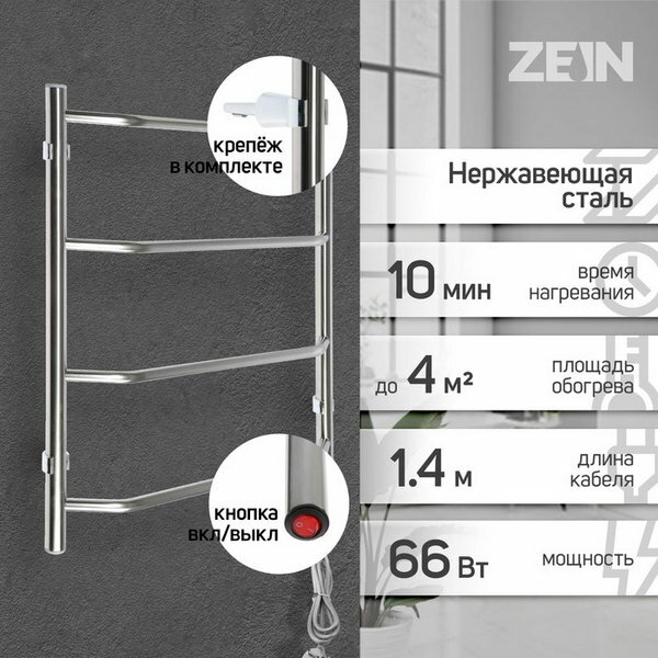 Полотенцесушитель электрический Zein "Виктория", 400х600 мм, 4 перекладины Zein 9406548 .