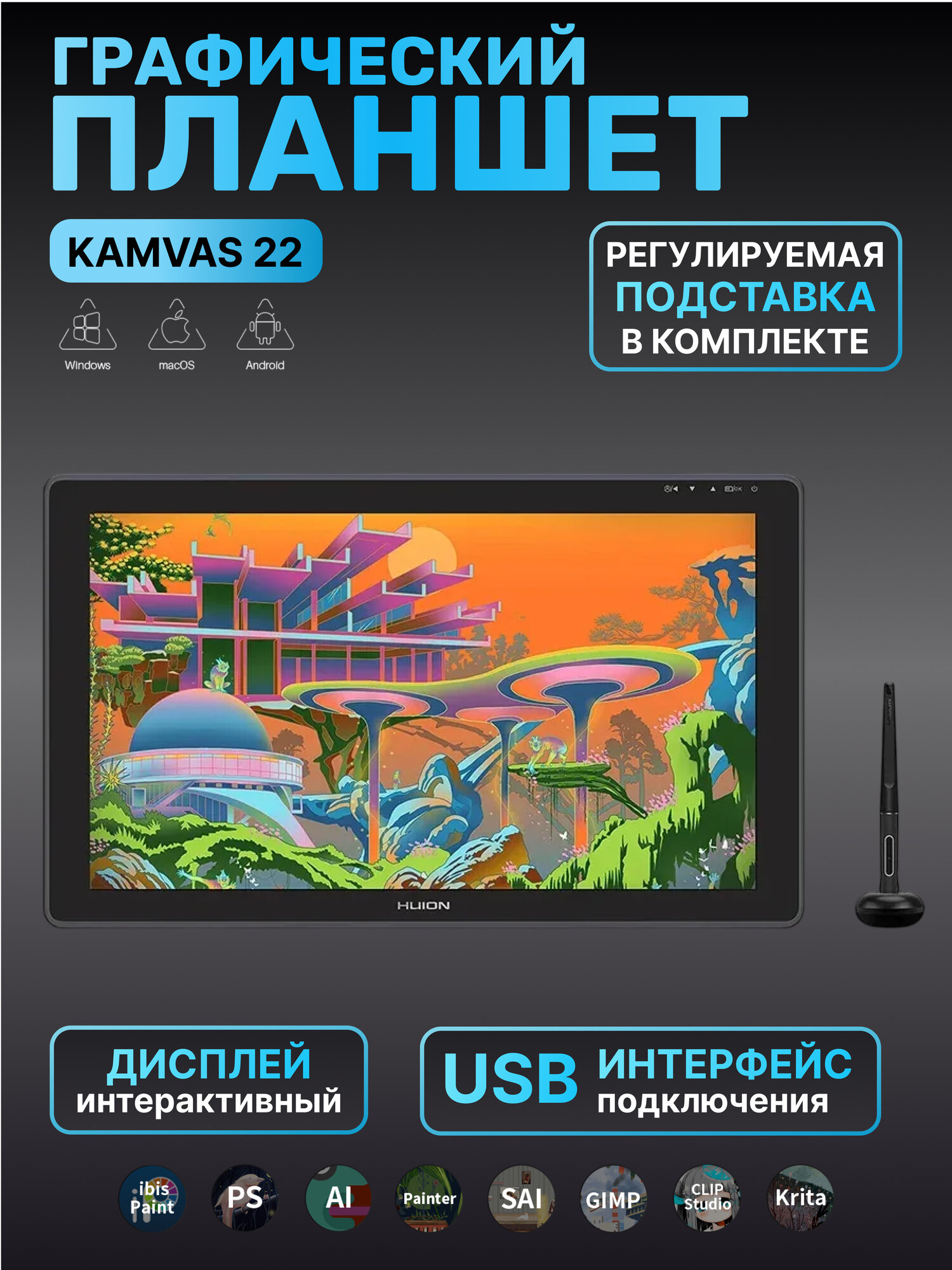 Интерактивный дисплей Huion KAMVAS 22 графический планшет 21.5" интересное: