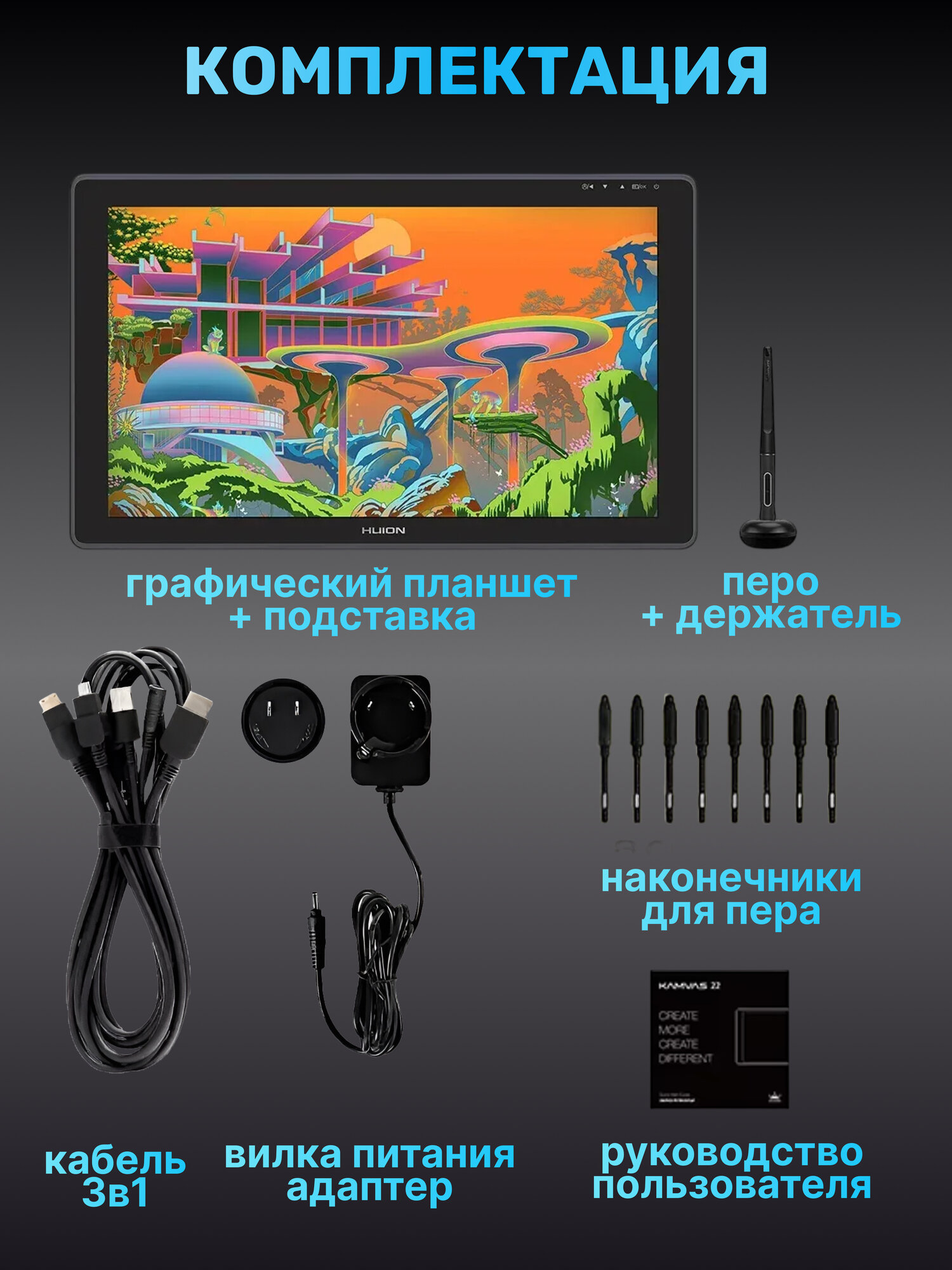 | Подробная комплектация | монитор, перо, подставка для пера, подставка для монитора, сменные наконечники и пинцет для замены, кабели для подключения, салфетка для очистки экрана, перчатка, краткое руководство пользователя, гарантийный талон |