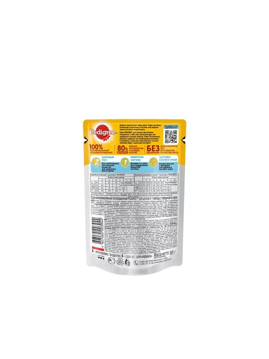 Корм консервированный для щенков PEDIGREE с говядиной в соусе, от 1 месяца, полнорационный, 85г, 24 шт.