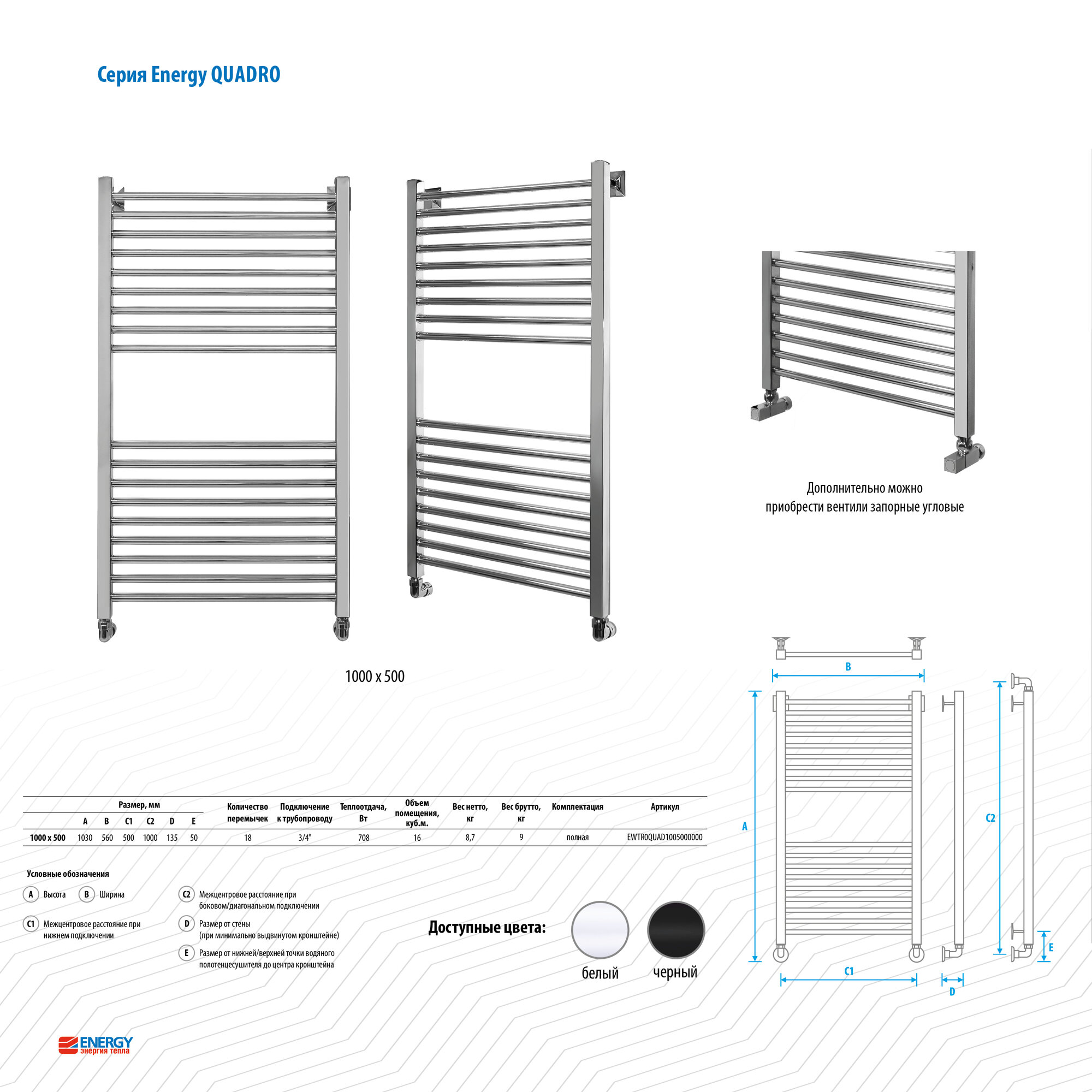 Купить Полотенцесушитель водяной Energy Quadro 1000x500 хром, полированная нержавеющая сталь, тип лесенка, подключение 3/4"
