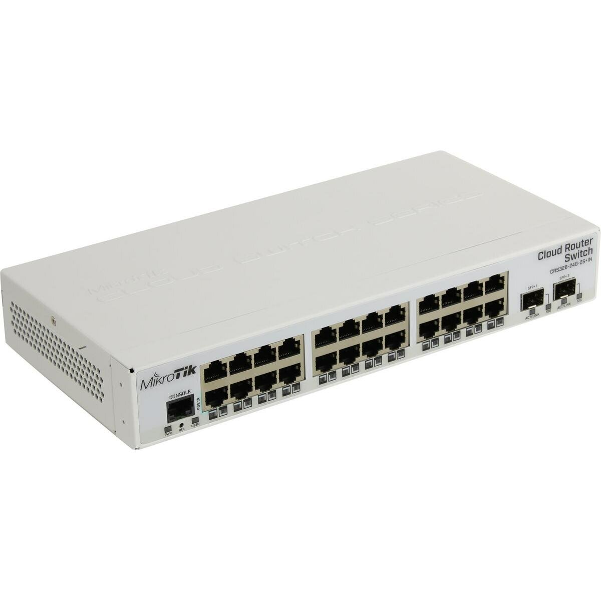 CRS326-24G-2S+IN with 800 MHz CPU, 512MB RAM, 24xGigabit LAN, 2xSFP+ cages, RouterOS L5 or SwitchOS (dual boot), desktop case, PSU