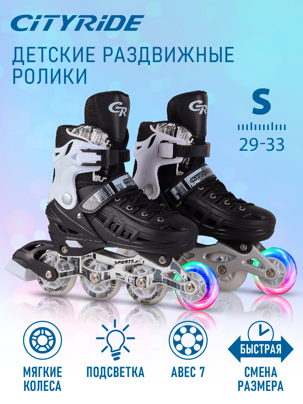 Роликовые коньки детские CITYRIDE, PU колеса/первое светится, ABEC 7, размер S (29-33), раздвижные, JB8800080/S(29-33)