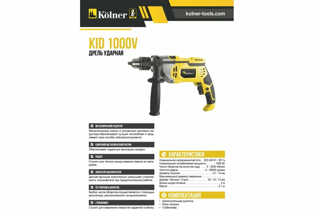 Ударная дрель Kolner KID 1000V, ключевой патрон, с ограничителем глубины сверления интересное: