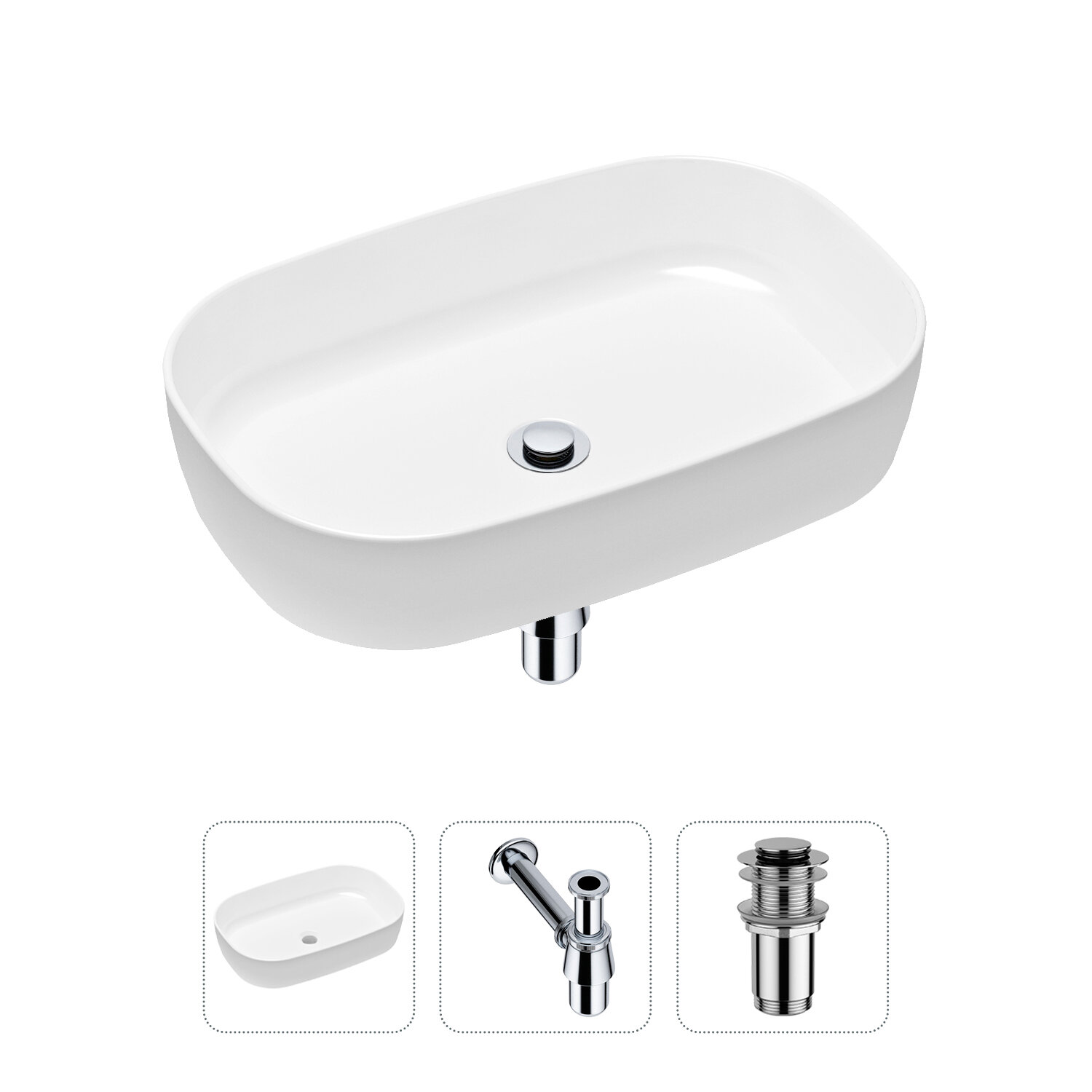 Комплект 3 в 1 Lavinia Boho Bathroom Sink 21520057: накладная фарфоровая раковина 54 см, металлический сифон, донный клапан