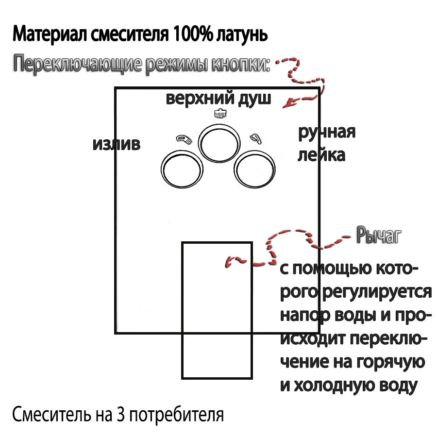 | Особенности | Тропический дождь -Чем больше по размеру верхняя лейка (верхний душ) / тем он приятнее. Оптимальным считается 250*250 мм. Прям как у нас... Так его хватает даже для мытья вдвоем…Тропический душ размером 250 мм позволит Вам получить максимальное наслаждение от каждого приема душа!Поворотный излив-Длина излива 240 мм. Излив поворачивается на 180 градусов.Излив поворотного типа удобен при повседневном использовании. Легко повернуть в нужную для Вас сторону.Встраиваемый смеситель(скрытого монтажа)-Глубина его погружения в стену от 55 мм до 75 мм. |