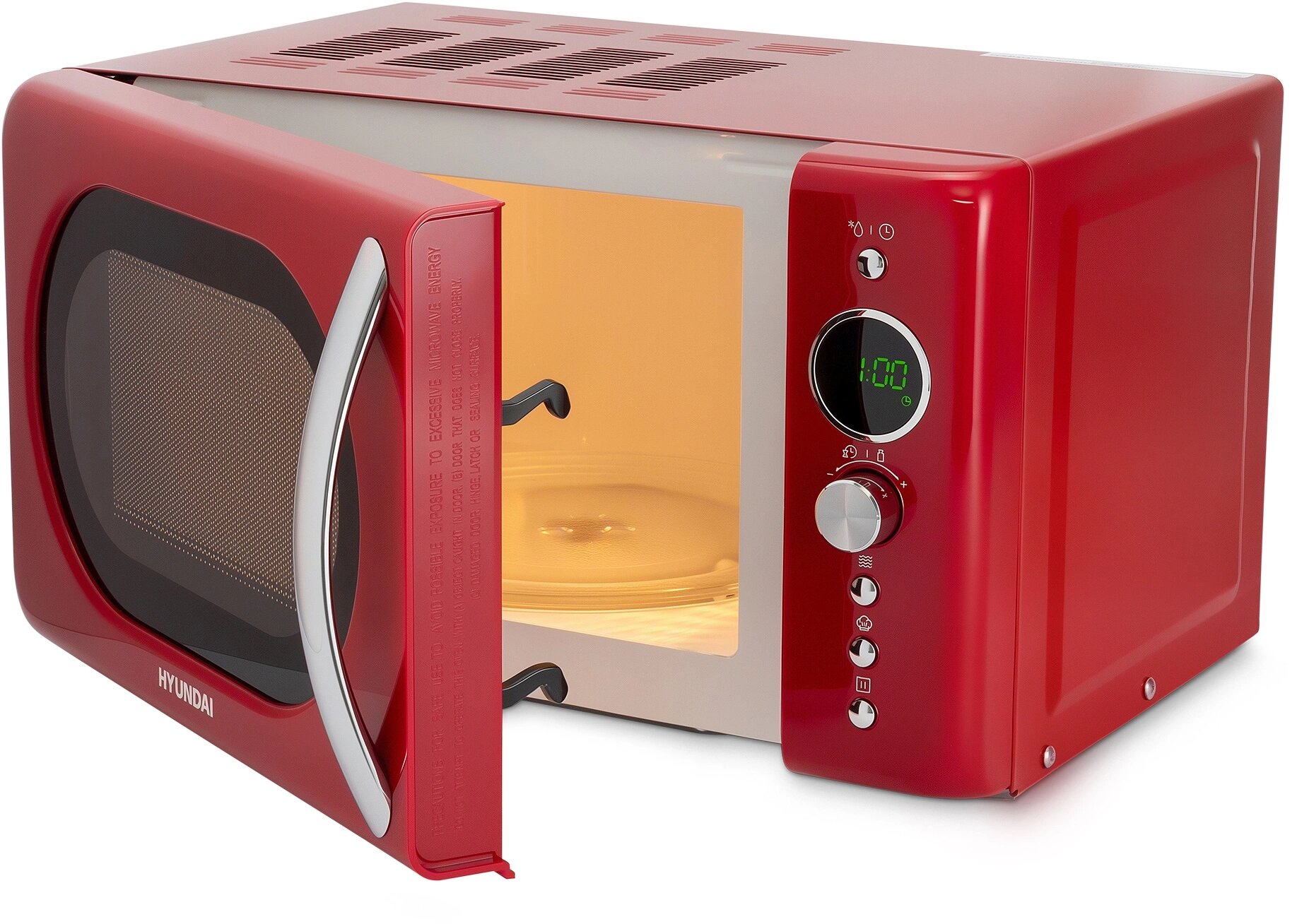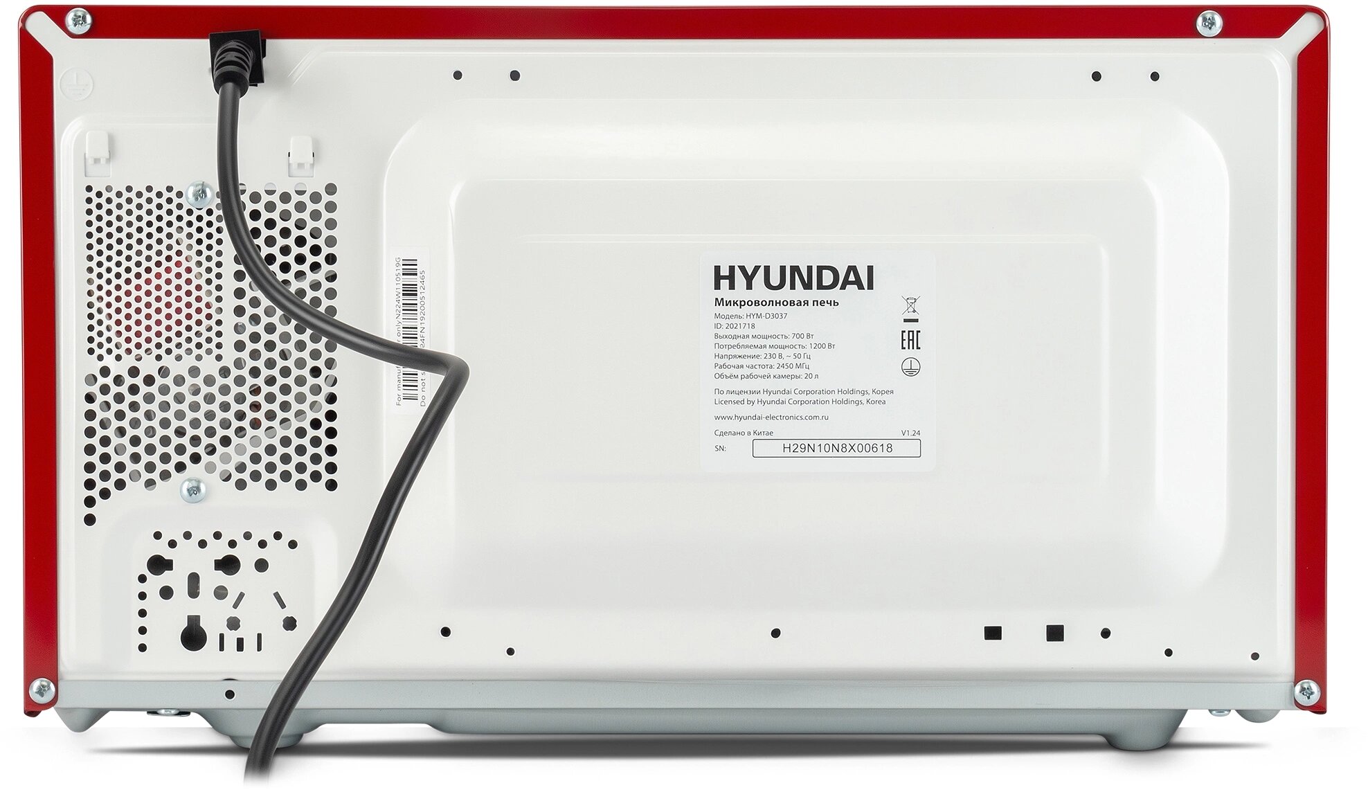 Микроволновая печь Hyundai HYM-D3037 красный, с механическим управлением, поворотным столом 24,5 см, объем камеры 20 л, мощность 700 Вт, открывание дверцы ручкой, функции разогрева и разморозки
