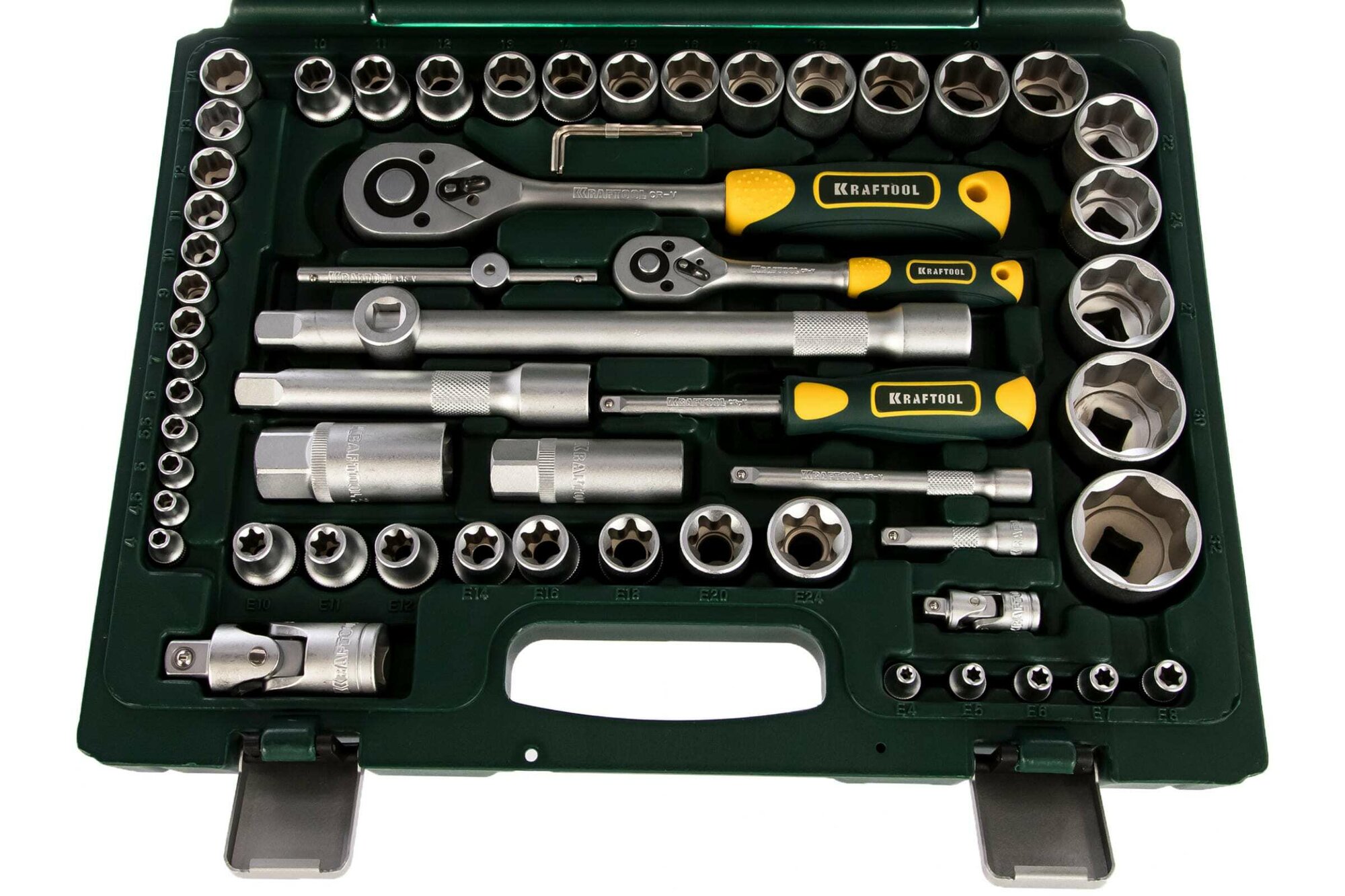 | Головки торцевые подробно | 1/4": 4, 4.5, 5, 5.5, 6, 7, 8, 9, 10, 11, 12, 13, 14 мм; длинные 1/4": 6, 7, 8, 9, 10, 11, 12, 13 мм; Torx 1/4": E4, E6, E6, E7, E8; 1/2": 10, 11, 12, 13, 14, 15, 16, 17, 18, 19, 20, 21, 22, 24, 27, 30, 32 мм; длинные 1/2": 14, 15, 17, 19, 22 мм; Torx 1/2": E10, E11, E12, E14, E16, E18, E20, E24; свечные 1/2": 16, 21 мм; с битами 1/4": PH1, PH2, PZ1, PZ2, T5, T10, T15, T20, T25, T27, T30, H3, H4, H5, H6, SL4, SL5, SL7 |