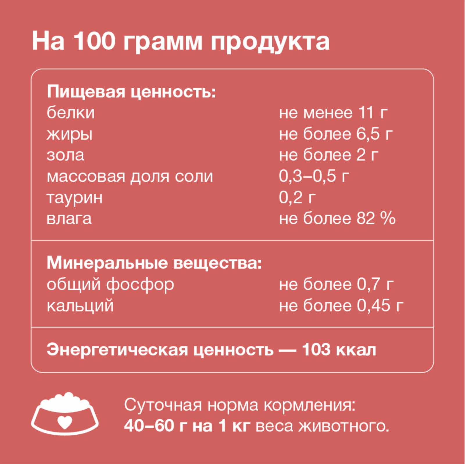 | Пищевая ценность | белки - не менее- 11,0 %, жиры - не более 6,5 %, зола - не более 2,0 %, массовая доля соли - 0,3-0,5 %, таурин - 0,2 %, влага - не более 82,0% |