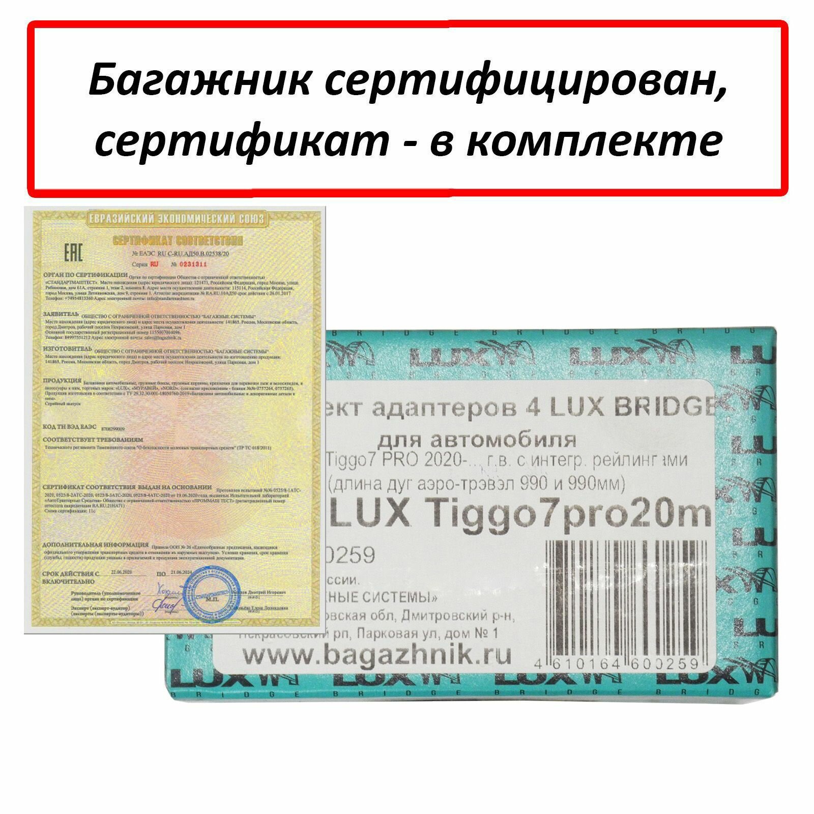 | Дополнительная информация | Бесшумная багажная система Lux Bridge (враспор, без вылетов) на интегрированные рейлинги Chery Tiggo 7 PRO, производство - Lux (Россия, Москва). Черные дуги. |