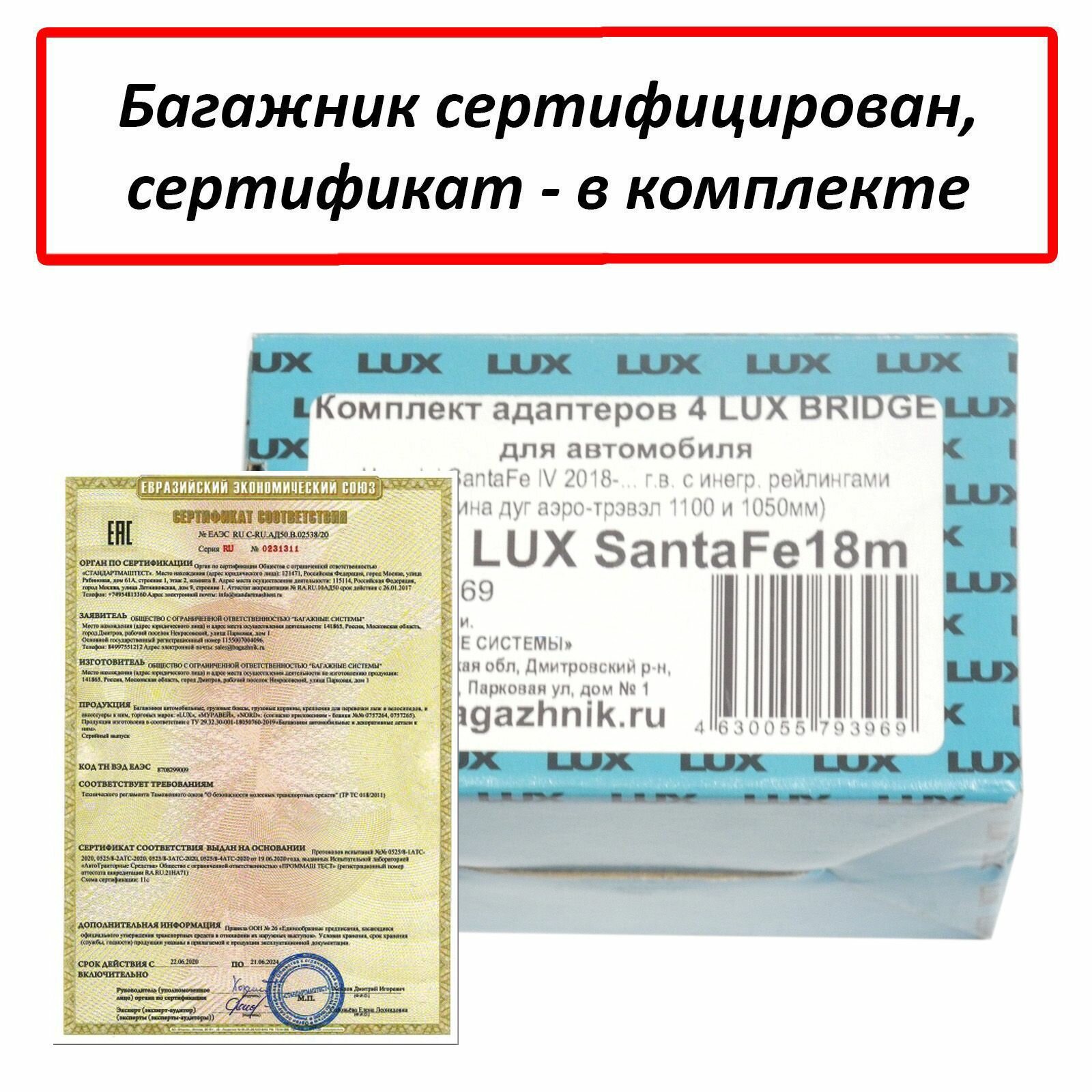 | Подробная комплектация | Комплект крыловидных дуг, комплект опор БК4 (Lux Bridge), комплект адаптеров для Hyundai Santa Fe 4 (2018-2021) |