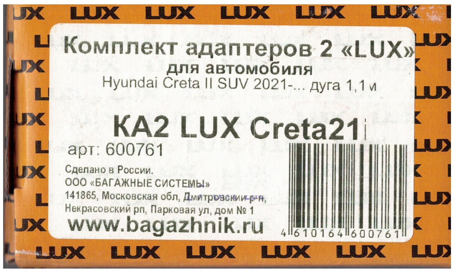 | Дополнительная информация | Багажник на автомобиль Hyundai Creta 2021-..., с интегрированными рейлингами, марка Lux, с чёрными крыловидными дугами. |