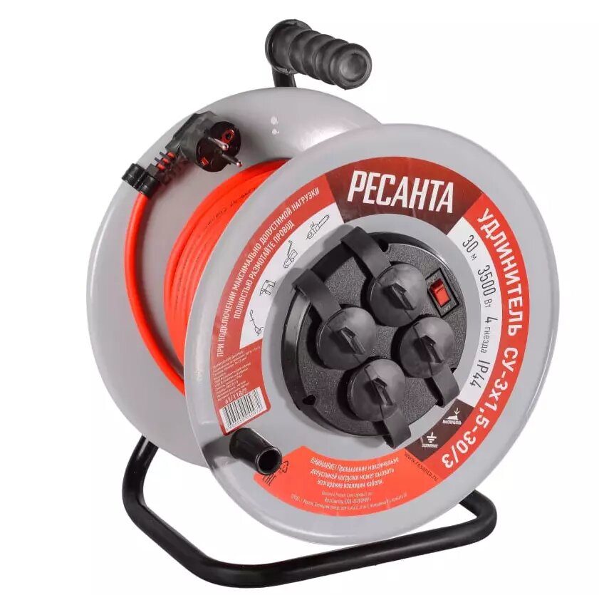 Удлинитель РЕСАНТА СУ-3х1,5-30/3 // 30м, 4 розетки, катушка -металл, с выключателем, силовой