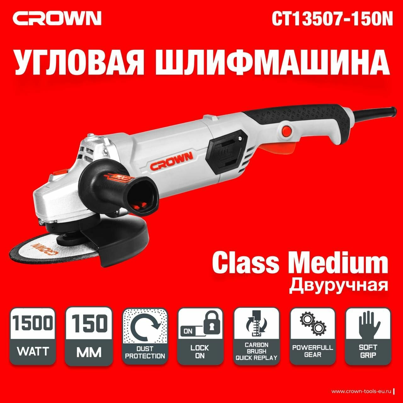 Купить Болгарка электрическая 150мм CROWN CT13507-150N, УШМ 1500Вт, 9500 об/мин, Функция блокировки
