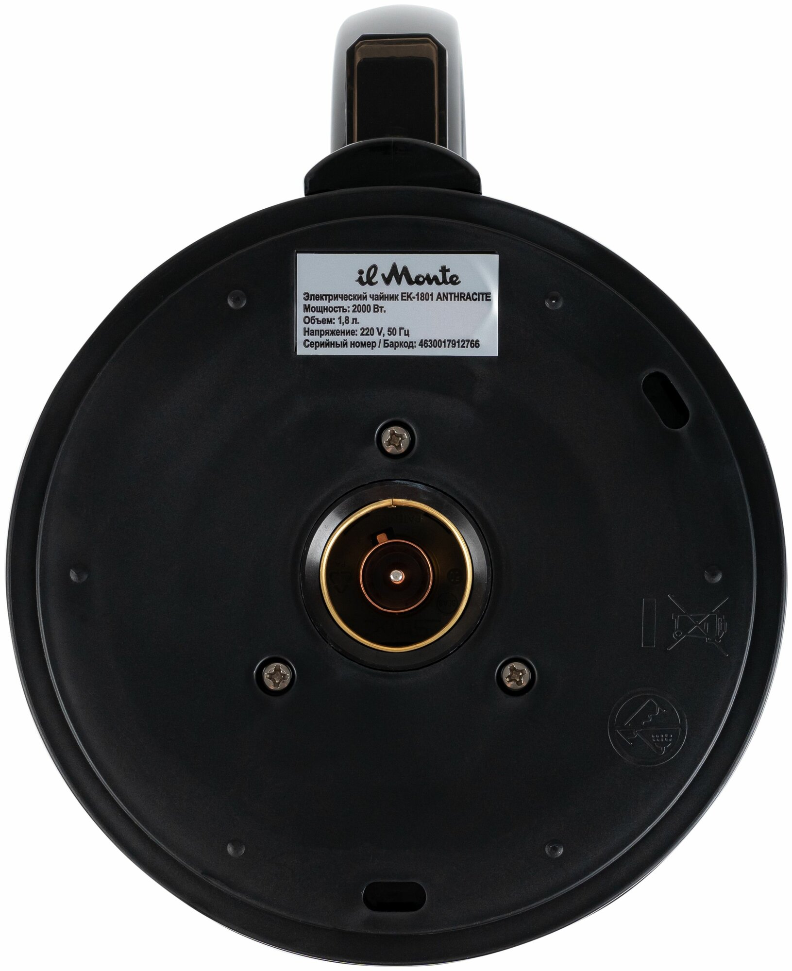 Чайник электрический Премиум с адиабатным покрытием, Контактная группа (электроника) STRIX, Не нагревающийся, Полностью из нержавеющей стали, Литая стальная колба внутри, Объем 1,8 л., il Monte EK-1801 ANTHRACITE