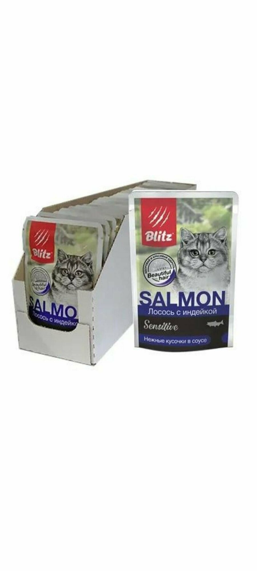 BLITZ SENSITIVE для взрослых кошек с чувствительным пищевар с лососем и инд в соусе пауч 85 гр 85 гр х 4 шт