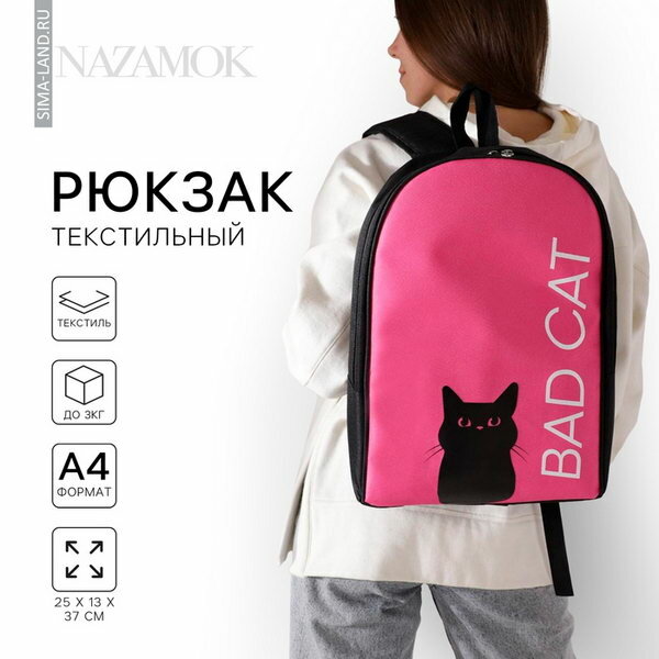 NAZAMOK Рюкзак текстильный "Bad cat", 25х13х37 см, фуксия