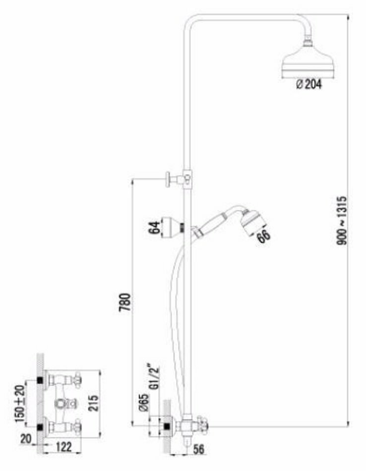 | Дополнительная информация | высота стойки для душа: 1315 мм; диаметр душевой лейки: 66 мм; диаметр верхнего душа: 204 мм |