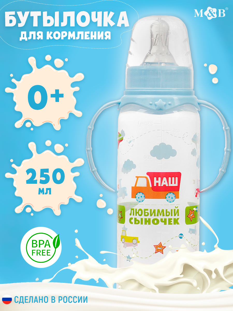 Бутылочка для кормления Mum&Baby "Сыночек" классическая, с ручками, 250 мл., для детей и малышей от 0 месяцев , цвет голубой