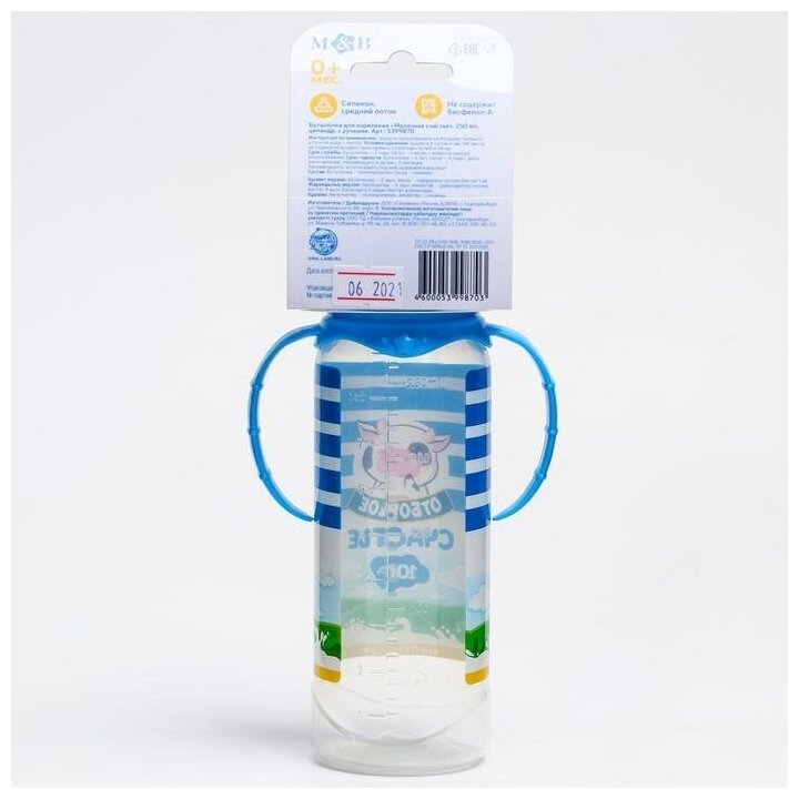 Бутылочка для кормления малыша M&B «Молочное счастье», классическое горло, с ручками, от 0 мес., 250 мл., цилиндр