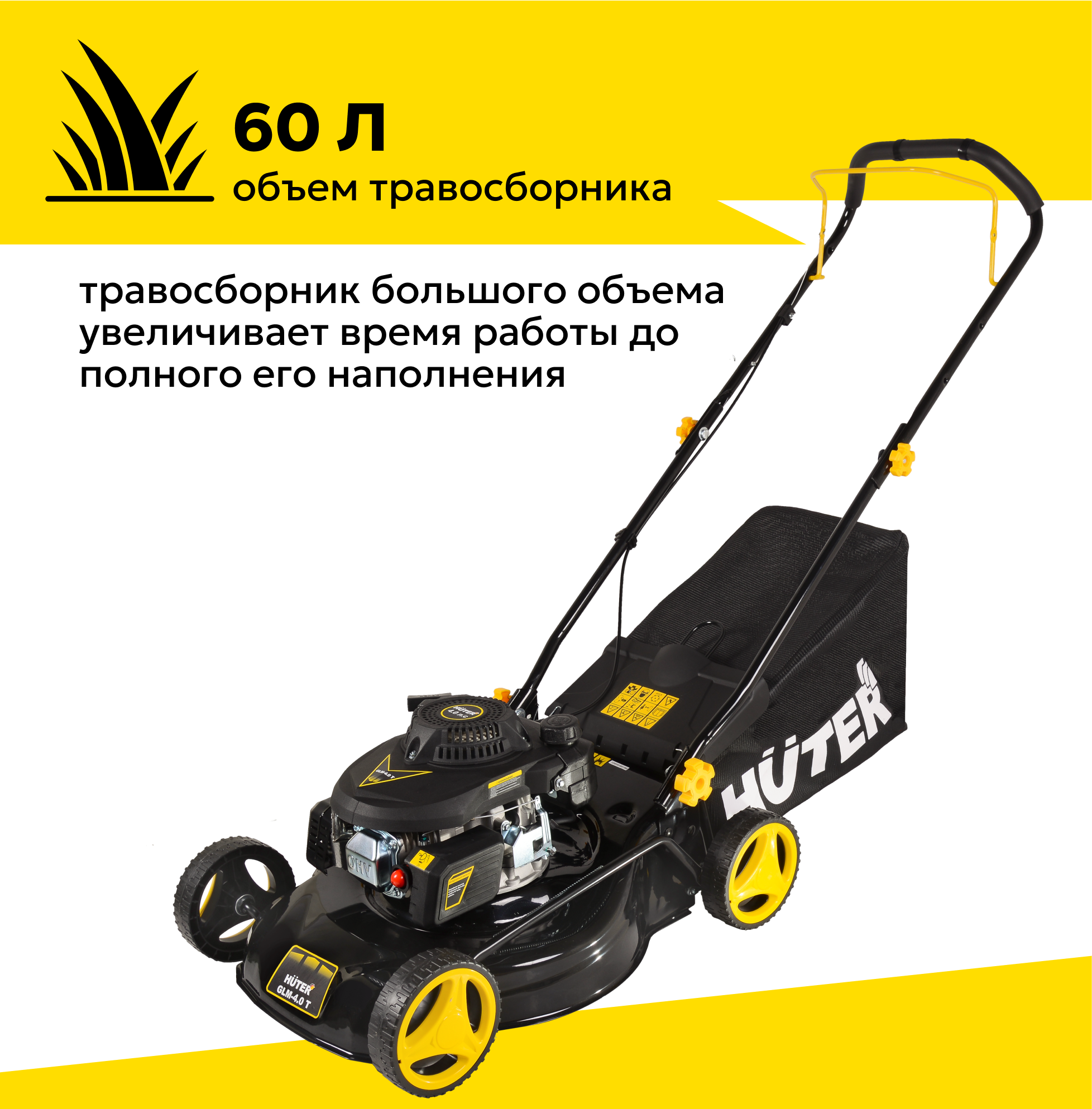 Газонокосилка бензиновая HUTER GLM-4.0Т, 4 л. с, ширина скоса 46см, тканевый травосборник на 60л интересное:
