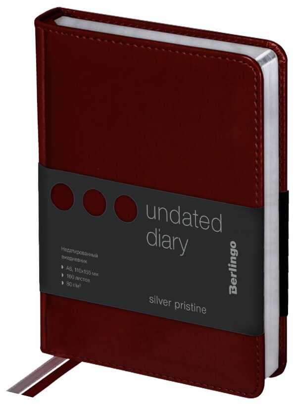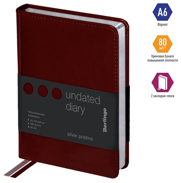 Ежедневник недатированный Berlingo A6, 160 листов, кожзам, "Silver Pristine", серебряный срез, красный (UD0_82602)