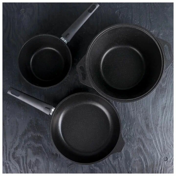 | Дополнительная информация | Материал крышек: стекло; материал ручек: бакелит; диаметр/высота стенок: кастрюля 240х143 мм (диаметр дна 163 мм); ковш 180х95 мм (диаметр дна 130 мм); сковорода 240х60 мм (диаметр дна 197 мм); антипригарное покрытие Greblon Non-Stick C2+. |