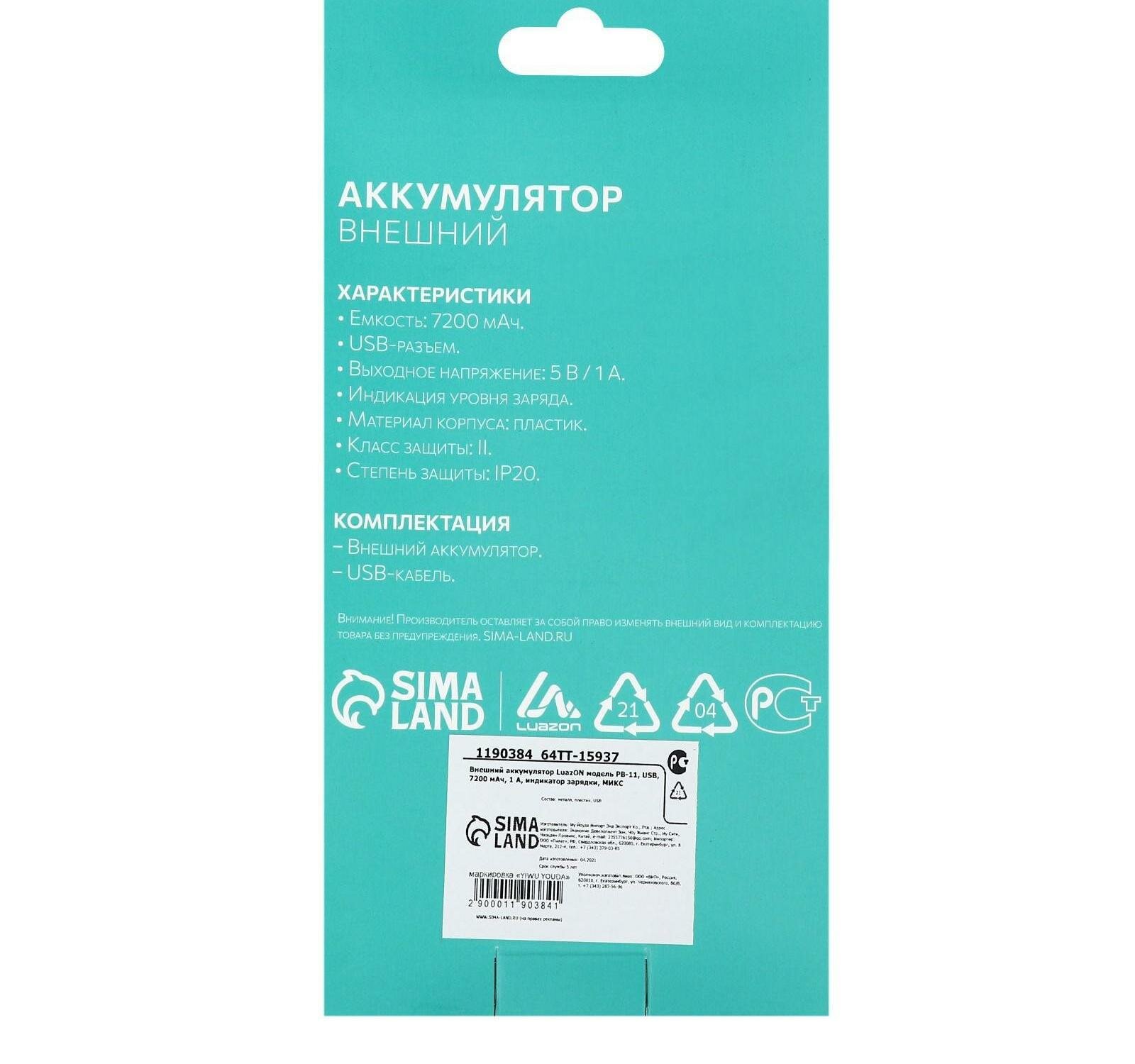 Купить Внешний аккумулятор Luazon модель PB-11, USB, 7200 мАч, 1 A, индикатор зарядки, микс 1190384
