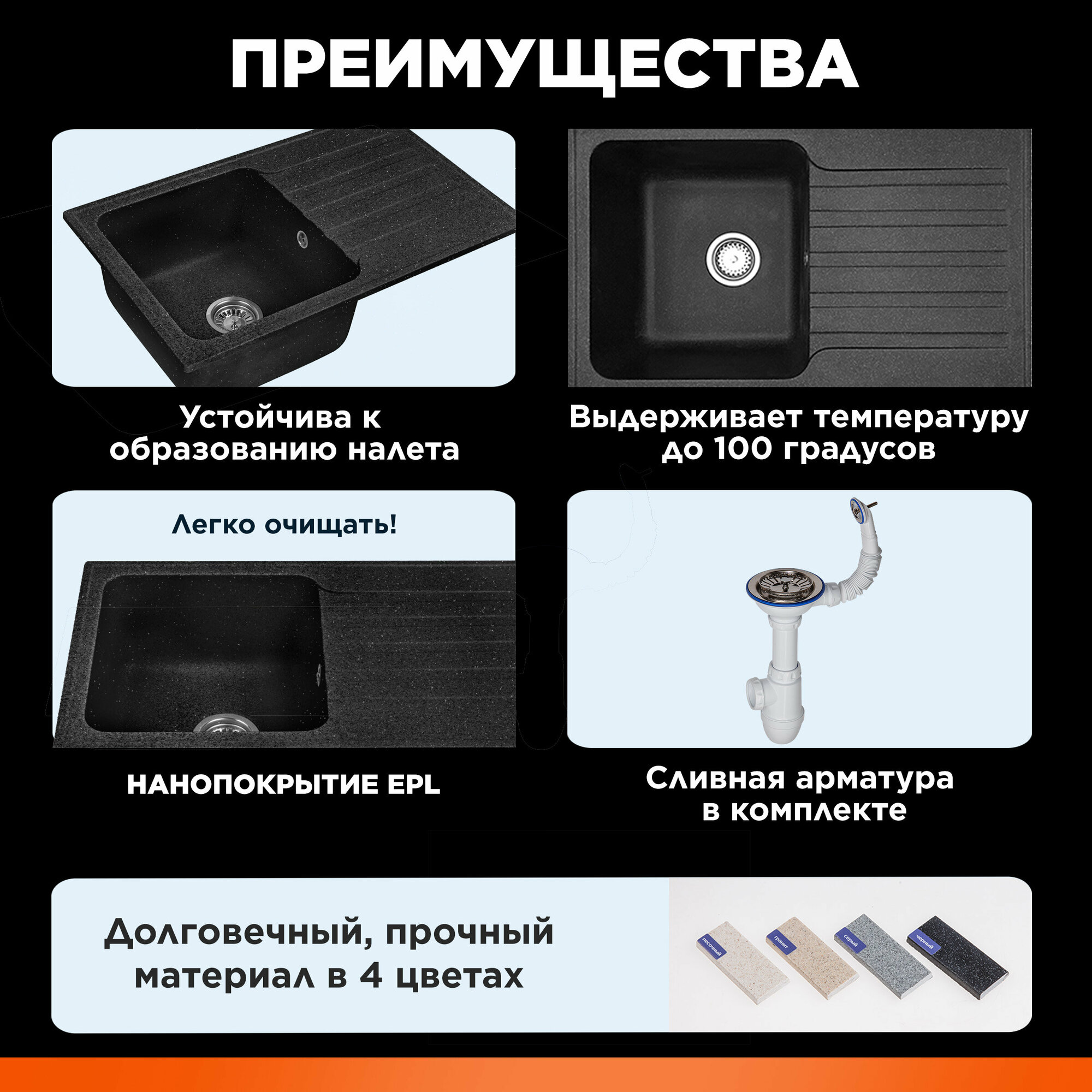 Мойка для кухни каменная AV ENGINEERING Unit 55х50, с сифоном (AVE550500BKA)