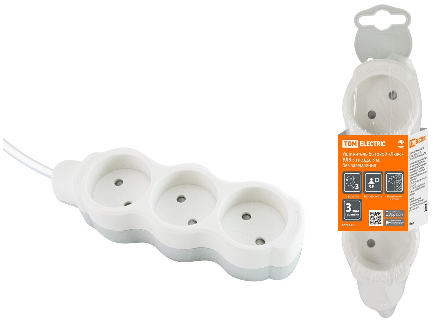 Удлинитель электрический "Люкс" УЛ03 TDM 3 гнезда с защитной шторкой, с заземлением, кабель 1,5 м, белый