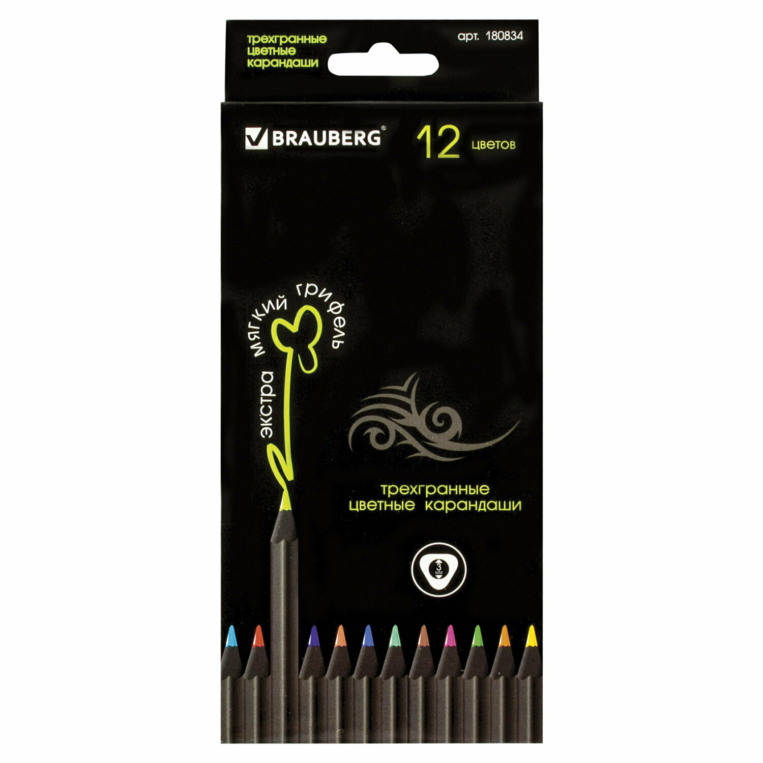 Карандаши цветные BRAUBERG "Black Jack", 12 цв., трехгранные, черное дерево, заточенные, картонная упаковка, 180834, 1 шт