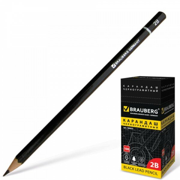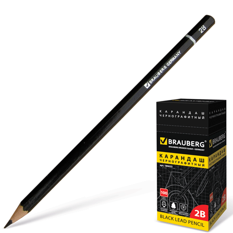 Карандаш чернографитный BRAUBERG, 1 шт., "Touch line", 2В, корпус черный, заточенный, 180623, 100 штук
