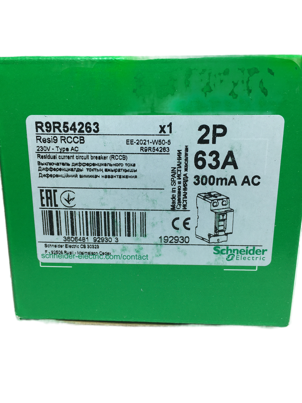 RESI9 Выключатель дифференциального тока (УЗО) 63А 2P 300мА тип AC, SCHNEIDER ELECTRIC R9R54263 (1 шт.)