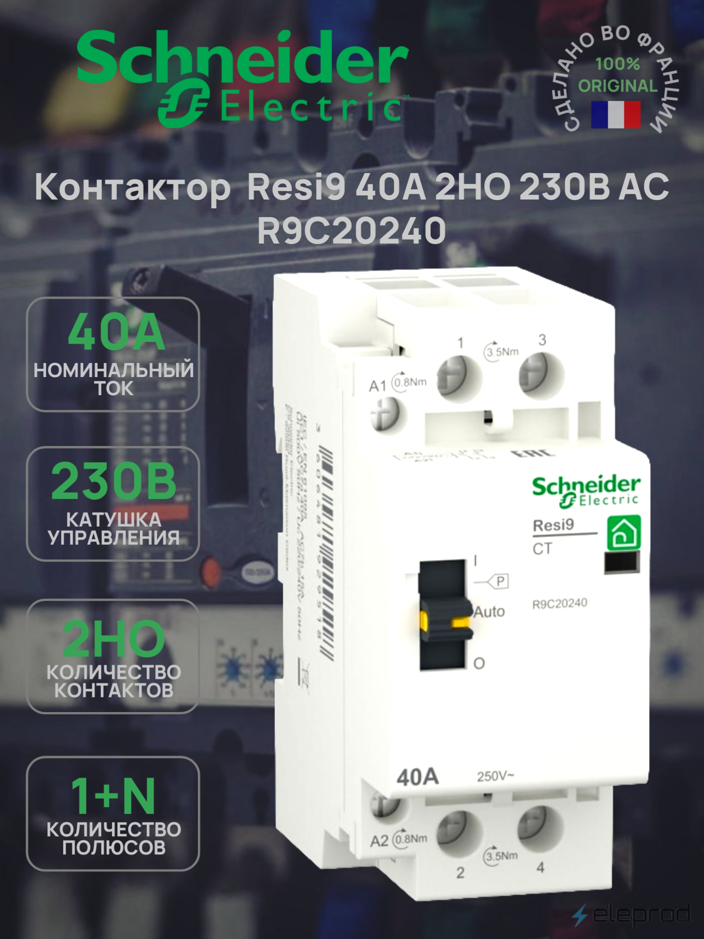 R9C20240 Контактор Schneider Electric Resi9 40А 1П+N, 2НО, 230/250В АС 50Гц