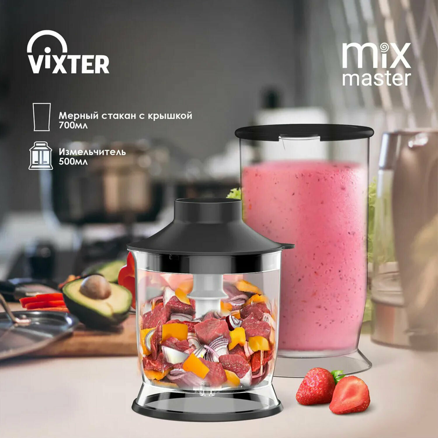 Блендер погружной VIXTER 3 в 1 HBW-2225, 1300 Вт, регулировка скорости, Turbo, 3 насадки, стакан черный