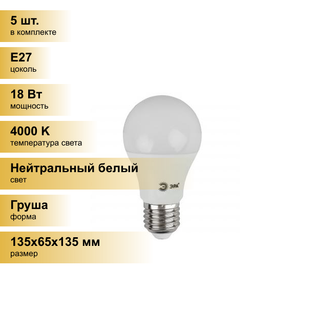 Сохранить(5 шт.) Светодиодная лампочка ЭРА ECO ЛОН A65 E27 18W (1440lm) 4000K 4K A65-18W-840-E27 R 135х65 Нейтральный белый. Цоколь E27 интересное: