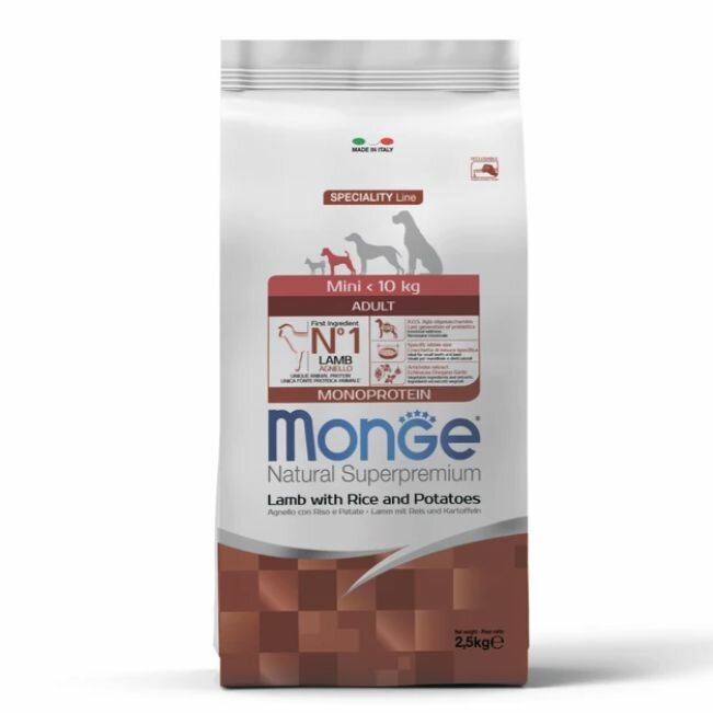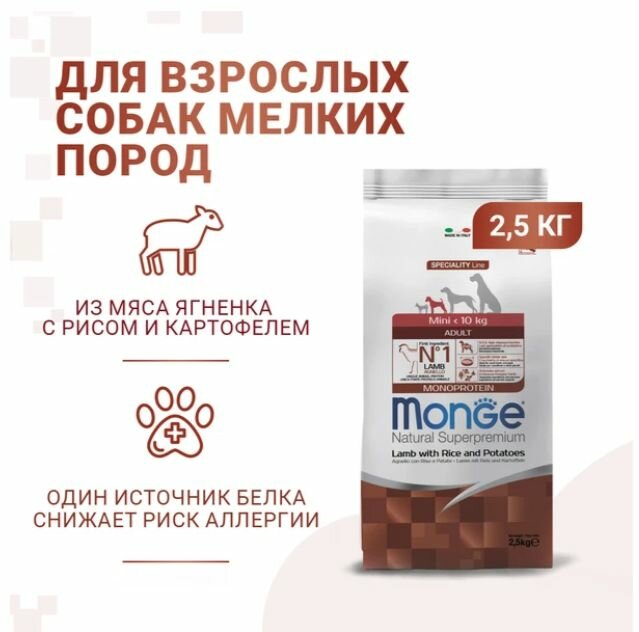 Сухой корм Monge Dog Speciality Line Monoprotein Mini, для взрослых собак мелких пород, из ягненка с рисом и картофелем 2,5 кг