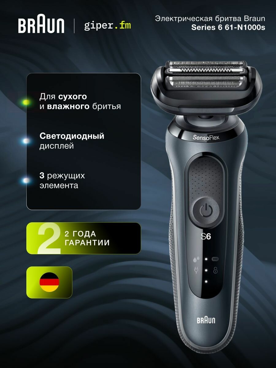 Электробритва мужская Braun Series 6 SensoFlex 61-N1000s, водонепроницаемая, с аккумулятором Li-ion, сетка SensoFoil, серый
