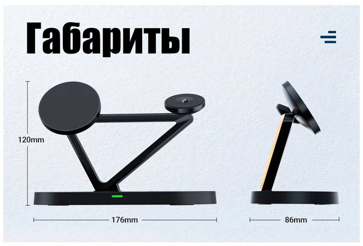 | Плюсы: | Заряжает хорошо одновременно и телефон и часы и наушники( вместо наушников можно положить второй телефон) поддерживает маг сейф |