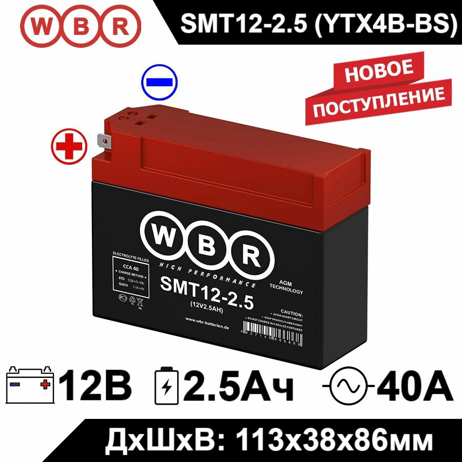 Купить Мото аккумулятор стартерный WBR MT12-2.5 12В 2,5Ач (12V 2.5Ah) полярность боковые, 40А (YTX4B-BS, CT 12025) AGM аккумулятор для мотоцикла, скутера, мопеда, гидроцикла, квадроцикла SMT12-2.5