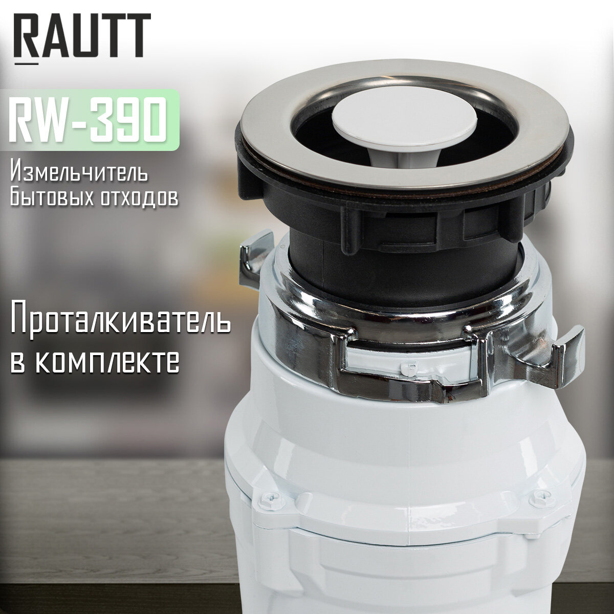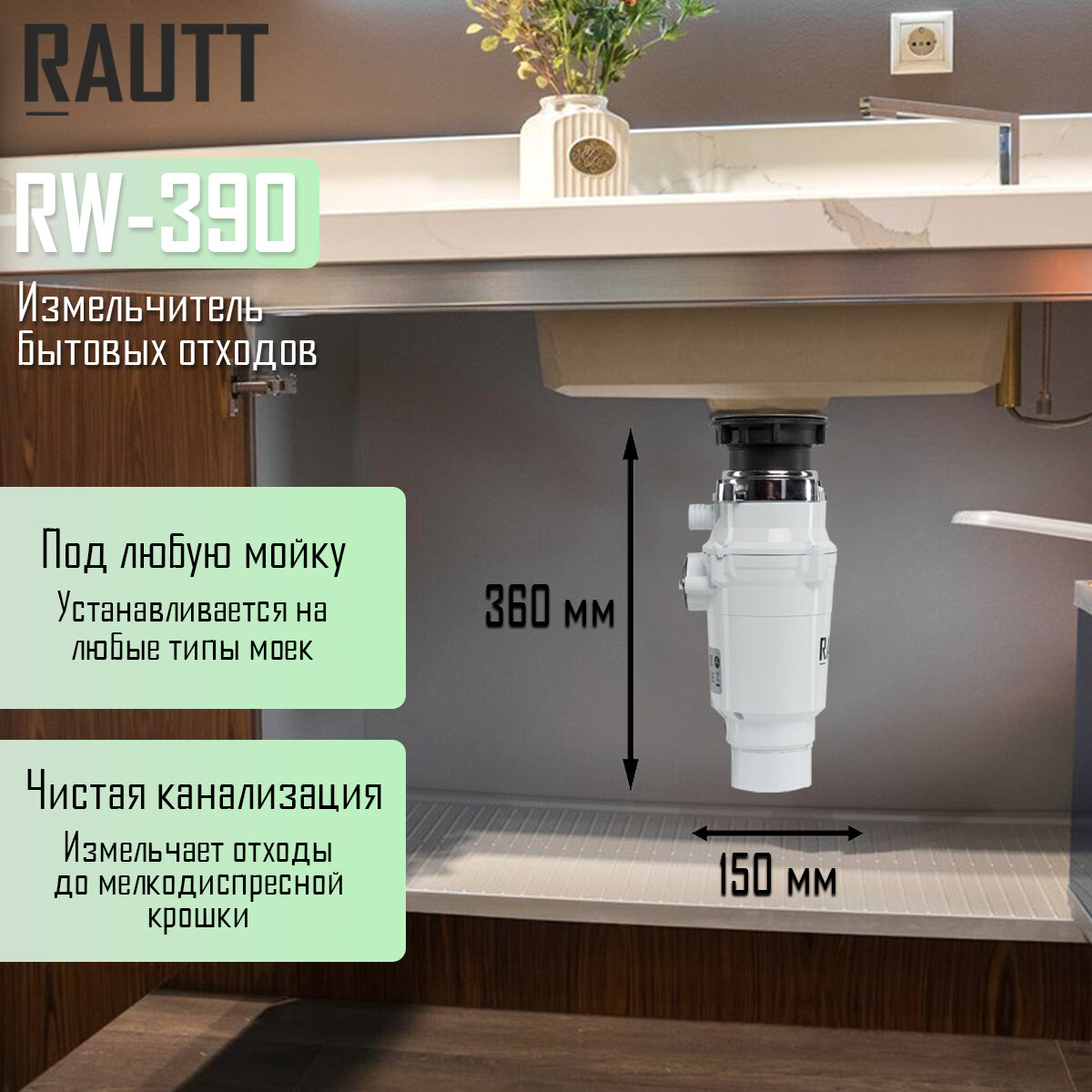 Измельчитель бытовых отходов RAUTT, RW-390, электрический, встраиваемый, 390 Вт, 1500 мл, измельчитель пищевых отходов кухонный