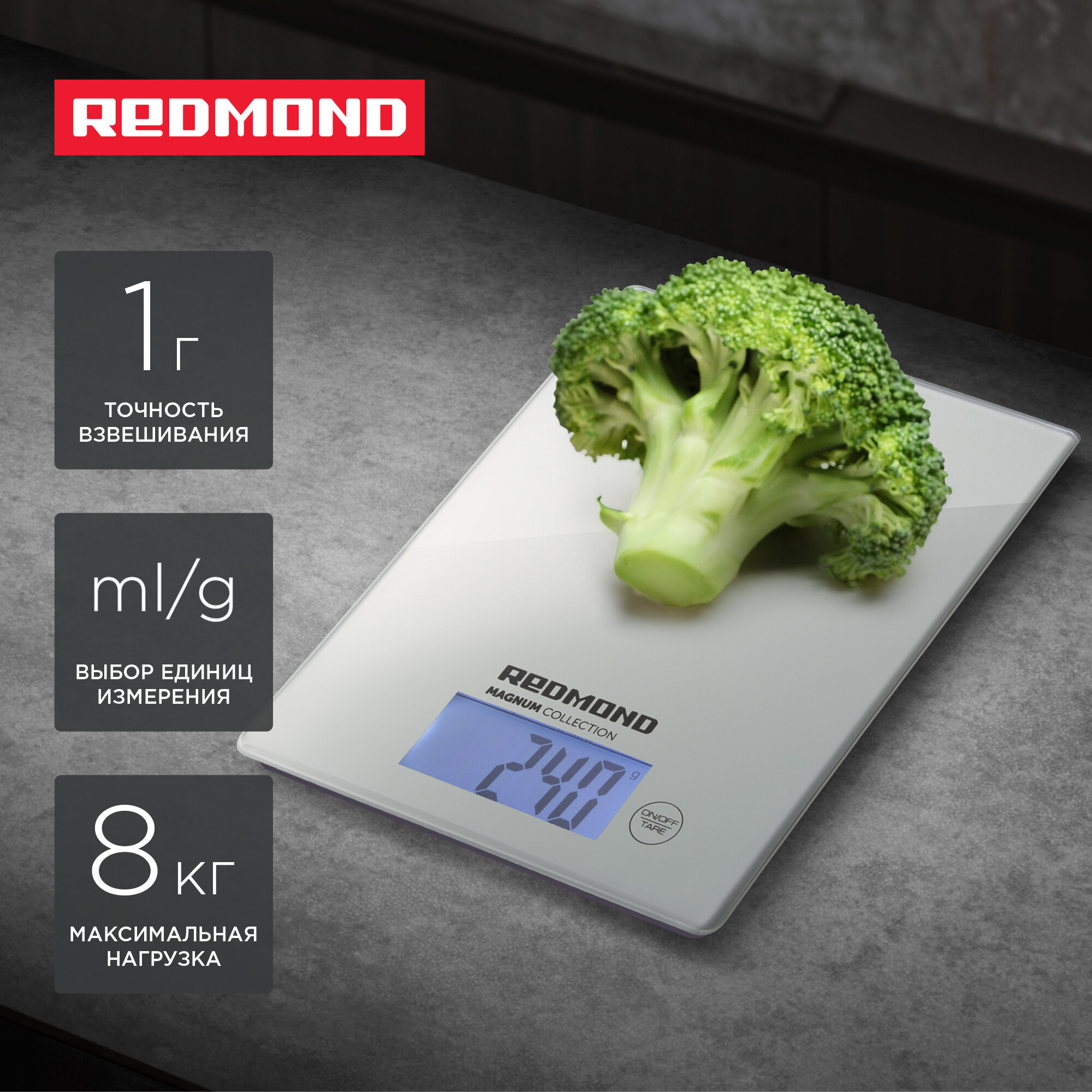 Весы кухонные REDMOND RS-772, закаленное стекло, точность до 1 гр, нагрузка до 8 кг, 4 ед. измерения, вычет тары, серый интересное:
