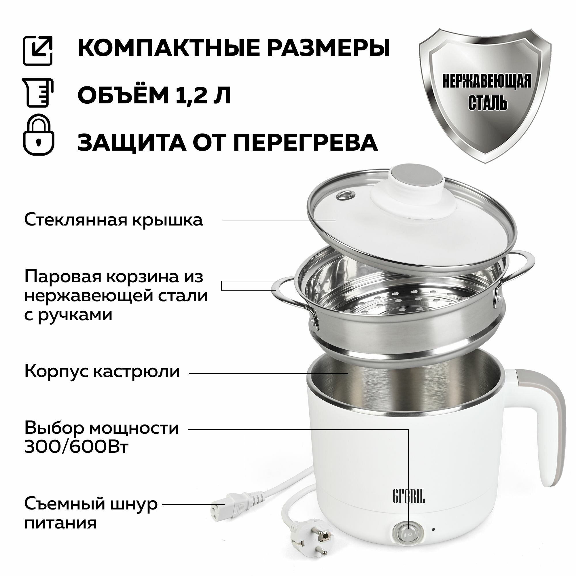Электрическая кастрюля 5 в 1 GFGRIL GFP-20, 1,2 л, белая, 600 Вт интересное: