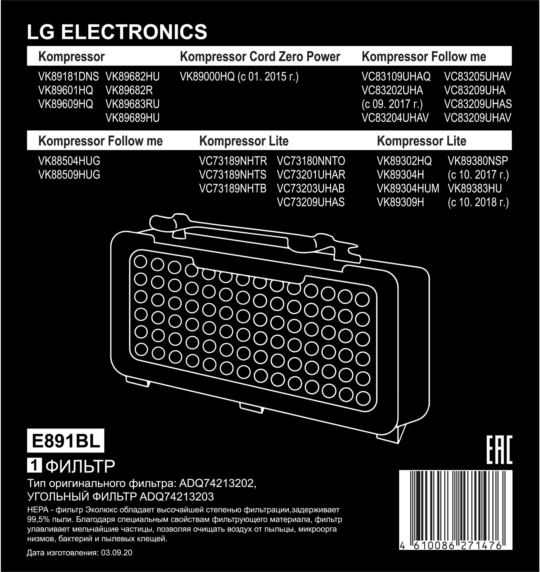 | Совместимые модели | LG Kompressor Lite VC73180NNTO, VC73201UHAR, VC73203UHAB, VK89304H, VK89380NSP (с 10.2017г.), VK89383HU (с 10.2018г.); Kompressor Follow me VC83202UHA (с 09.2017г.), VC83204UHAV, VC83205UHAV, VK88504HUG; Kompressor VK89601HQ, VK89682HU, VK89682R, VK89683RU; Kompressor Cord Zero Power VK89000HQ (с 01.2015г.) |