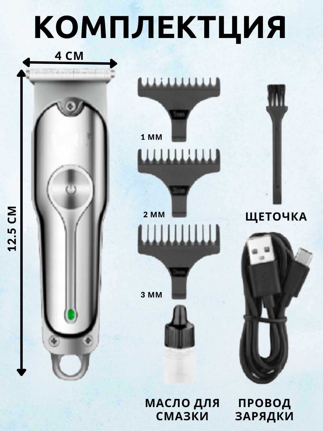 | Дополнительная информация | Комплектация: сменные насадки - 3 шт.(1, 2, 3 мм), кабель для зарядки - 1 шт., масло - 1 шт., щеточка для чистки ножей - 1 шт. |