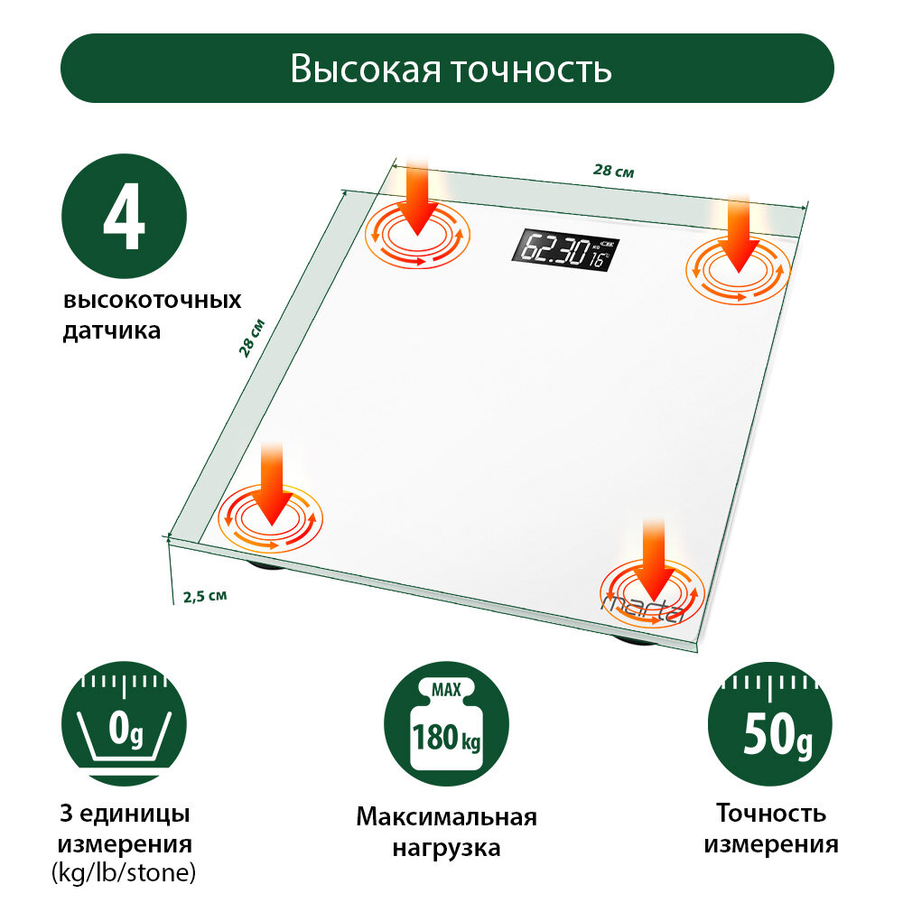 | Отзыв: | Ставьте весы на ровную поверхность без испкривлений, тогда будет точный результат.