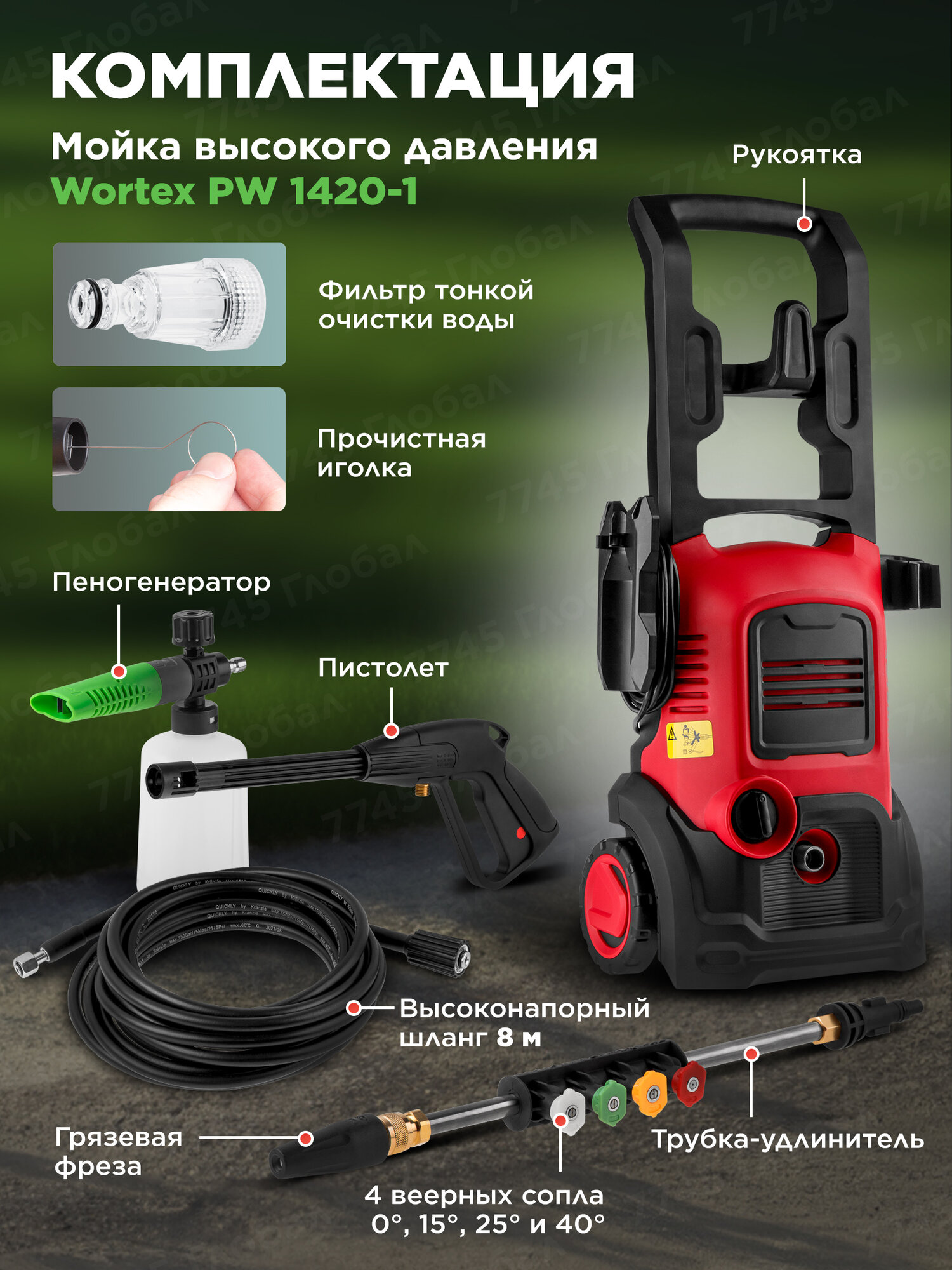 Очиститель высокого давления WORTEX PW 1740 2.40 кВт, 170 бар, 510 л/ч (мойка высокого давления, автомойка, ф-ция самовсасывания, шланг 8 м, 4 веерных