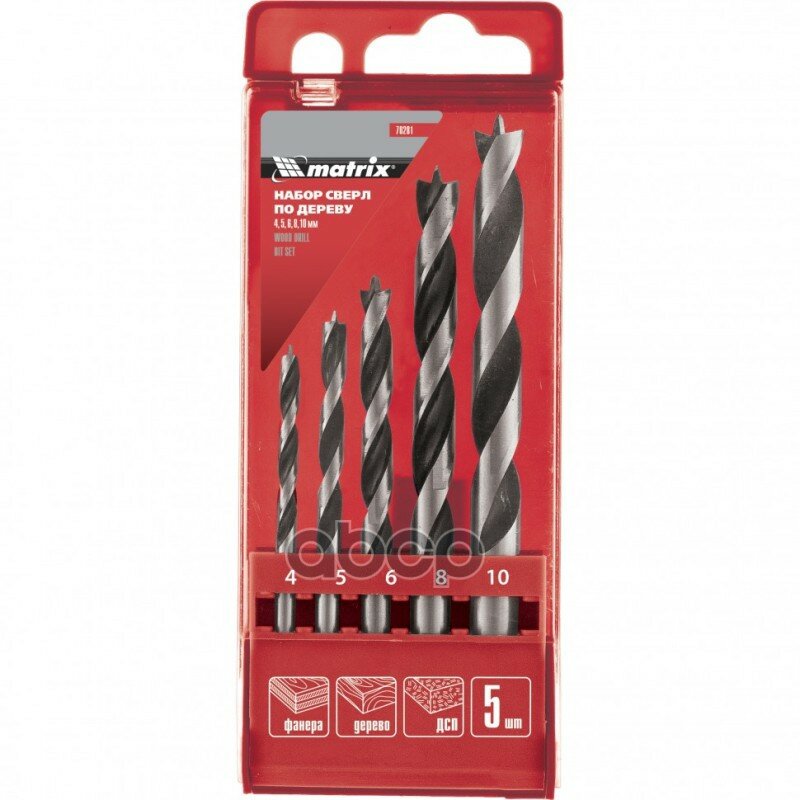 Набор сверл по дереву, 4-5-6-8-10 мм, 5 шт, цилиндрический хвостовиковик, пластиковый кейс, Matrix 70281