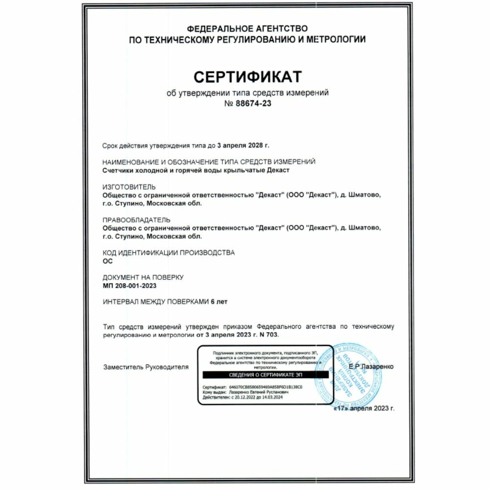 Счётчик горячей воды Decast СТВУ-150 ДГ импульсный