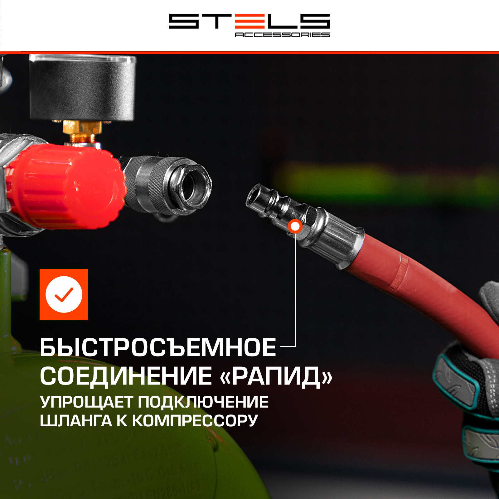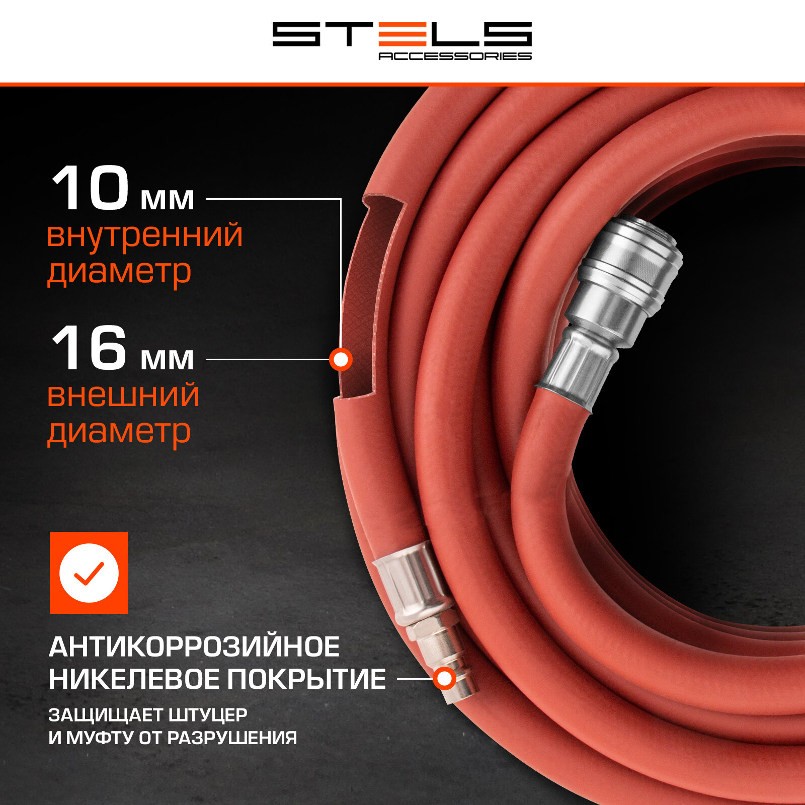 STELS 57023 Шланг пневматический резиновый, 10x16 мм, 24 бар, армированный, быстросъемное соединение, 20 м Ste STELS 57023